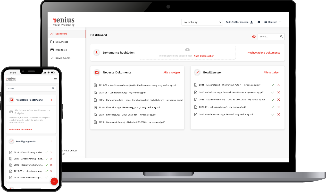 Durch welches Buchhaltungs- und Treuhandprozesse digitalisiert. Von Spesenerfassen via Mobile, Kreditkartenbelege, Rechnungen freigeben, Steuerunterlagen, Verträge bis zu Jahresabschlussrechnungen. Alles an einem Ort – immer und überall griffbereit.