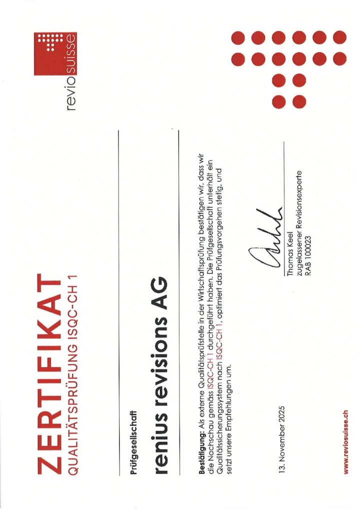 Wir freuen uns sehr, dass unsere Tochtergesellschaft, die renius revisions ag, die Qualitätsprüfung nach ISQC-CH 1 erfolgreich abgeschlossen hat und dafür von reviosuisse zertifiziert wurde. ✅